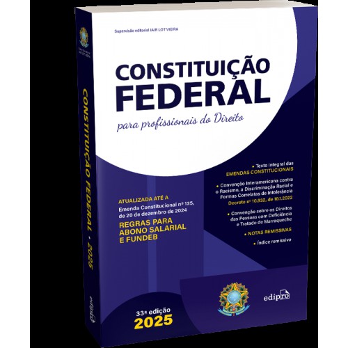 CONSTITUIÇÃO FEDERAL PARA PROFISSIONAIS DO DIREITO 2025 Atualizada até a Emenda Constitucional n° 135, de 20 de dezembro de 2024 – REGRAS PARA ABONO SALARIAL E FUNDEB Esta edição inclui as mais recentes alterações efetuadas pela Emenda Constitucional n° 135, de 20.12.2024, que altera as regras para Abono Salarial e Fundeb. INCLUI: Texto integral das Emendas Constitucionais Convenção Interamericana contra o Racismo, a Discriminação Racial e Formas Correlatas de Intolerância – Decreto n° 10.932, de 10.1.2022 Convenção sobre os Direitos das Pessoas com Deficiência e Tratado de Marraqueche Notas remissivas Índice remissivo