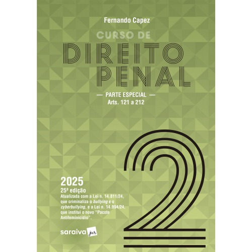 O Curso de Direito Penal, de Fernando Capez, composto por 3 volumes, é uma referência nacional no estudo do Direito Penal, escrito em uma linguagem descomplicada, com objetividade, sem perder a riqueza do conteúdo, o que facilita o entendimento da ma téria. Os volumes foram totalmente reformulados, revistos e atualizados, desde os novos entendimentos doutrinários e o que há de mais recente no debate dos Tribunais Superiores. A Coleção está dividida em três volumes. O volume 2 trata da Parte Espec ial do Código Penal - Parte Especial do Código Penal - Dos Crimes contra a pessoa a Dos Crimes contra o sentimento religioso e contra o respeito aos mortos (arts. 121 a 212), atualizada com a Lei nº 14.811/24 que criminaliza o bullying e o cyberbully ing e com a Lei nº 14.994/24 que institui o novo "Pacote Antifeminicídio". Data de fechamento da edição: 14/10/2024. ?