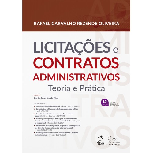 “(...) Pois foram exatamente esses os temas que constituíram o foco deste excelente estudo do Prof. Rafael Carvalho Rezende Oliveira. Tive o prazer de fazer a leitura da obra e, de plano, identifiquei a sistemática própria do profess or militante: a organização dos temas e a preocupação com o leitor, oferecendo exposição dotada de clareza e permitindo o exame dos tópicos em sequência lógica – elemento facilitador da compreensão. O trabalho foi dividido em quatro pilares de susten tação: em primeiro lugar, o estudo da licitação depois, os temas especiais sobre as licitações em terceiro lugar, os contratos administrativos e, por último, os temas especiais a respeito dos mesmos contratos. Embalado pelas modernas correntes dou trinárias e pelas necessárias trilhas jurisprudenciais, o autor discorre com muita propriedade sobre os temas e propicia a quem os lê o integral conhecimento de seu conteúdo. (...)”.