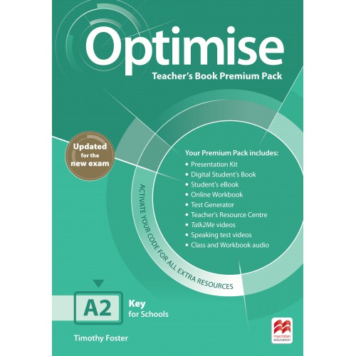 Optimise is a comprehensive, four-level exam preparation course designed to take students from A2 level right through to B2. Optimise will comprehensively prepare students for all of those exams, and it follows the high standards set by the highly su ccessful Macmillan Laser series.The Optimise series includes the following print components for every level: Student''''''''s Book, Workbook, Teacher''''''''s Book. The series also has a strong digital element and digital components are: Digital Student''''''''s Book, eBook, Student''''''''s Resource Centre, Online Workbook, Teacher''''''''s Presentation Kit, Teacher''''''''s Resource Centre, Test Generator. The Resource Centres will host a variety of worksheets and tests designed to consolidate learning and enhance ex am preparation.