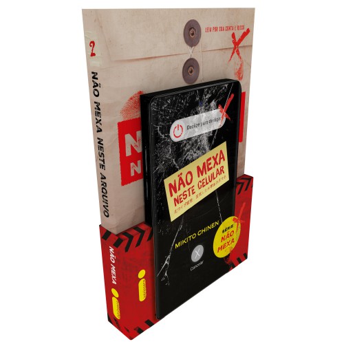 O melhor do terror japonês em uma experiência literária inovadora.Dois livros: celular + pasta de arquivosNa série Não mexa, os piores pesadelos podem estar nos objetos mais simples: uma latinha de bebida, uma revista, ou até mesmo… seu celular, que passa o dia inteiro colado com você. Em Não mexa neste celular, o leitor tem acesso ao telefone de Kazuma Isshiki, no formato exato de um smartphone. O jovem universitário quer muito arranjar um emprego para conseguir morar com a namorada, mas, duran te uma aventura que pode ajudá-lo a conseguir um trabalho, acaba se deparando com algo assustador. No livro, a experiência imersiva intercala texto e capturas de tela de celular, convidando quem lê a adentrar uma história sinistra.Não mexa neste arqu ivo apresenta uma narrativa dinâmica, construída a partir de transcrições de entrevistas e registros da avaliação psiquiátrica do autor de um assassinato em massa que choca todo o Japão. Transtornado pela crença de que está sendo constantemente obser vado por um monstro, o assassino se mostra inquieto, paranoico, e seu estado mental o leva a tomar medidas drásticas. Mas o que seria essa entidade misteriosa capaz de deixar alguém com tanto medo?Depois de ler os dois livros — celular e pasta de arq uivos —, vários pontos suspeitos e ocorrências à primeira vista aleatórias passam a se conectar. Entre plantas baixas, reportagens, imagens sinistras e outros documentos inquietantes, aos poucos a verdade por trás desses casos completamente bizarros vai se revelando. Para descobrir o segredo por completo, basta embarcar nessa experiência literária inovadora e macabra. Apenas lembre-se de que toda escolha tem consequências.