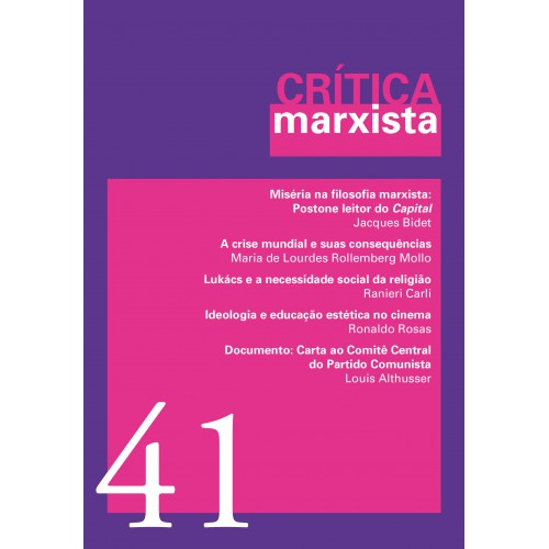 Revista semestral de difusão e discussão da produção intelectual marxista em sua diversidade, bem como de intervenção no debate e luta teórica. Nesta edição: O lugar do conceito de fascismo na teoria marxista do Estado Novas caracterizações de Marx após a Marx-Engels-Gesamtausgabe (MEGA2) A “nova leitura de Marx” e a teoria da emancipação – um panorama das contribuições recentes na Alemanha 150 anos de Rosa: contribuições de Rosa Luxemburgo para a teoria política contemporânea Apresentação: “W. E. B. Du Bois: Marx, o marxismo e o comunismo” O socialismo e o problema do negro (1913) Karl Marx e o negro (1933) O marxismo e o problema do negro (1933) Pedido de adesão ao Partido Comunista dos EUA (1961) Revisitando a obra de Mao Zedong Viena vermelha e austromarxismo: uma breve introdução A Viena vermelha: uma utopia social-democrata Marx e a crítica do modo de representação capitalista [Jorge Grespan] Escritos sobre a Guerra Civil Americana [Karl Marx e Friedrich Engels] Teo ria marxista e análise concreta: textos escolhidos de Louis Althusser e Étienne Balibar [Thiago Barison (org.)] Capitalismo em debate: uma conversa na teoria crítica [Nancy Fraser e Rahel Jaeggi] Karl Marx’s Life, Ideas, and Influences: a critical Examination on the bicentenary [Shaibal Gupta, Marcello Musto e Babak Amini (orgs.)] Educação e classe social: o papel da classe média na formação do sistema de escola pública, na França (1880-1940) e no Brasil (1889-1940) [Décio Saes] Classes médi as e política no Brasil: 1922-2016 [Adalberto Cardoso] Marx e as Questões Contemporâneas [Caio Bugiato, Lúcia Valadares Sartório e Márcio Rufino (orgs.)] Uberização, trabalho digital e indústria 4.0 [Ricardo Antunes (org.)] Geopolítica da Interven ção: a verdadeira história da Lava-Jato [Fernando Augusto Fernandes] As guerras mundiais: ensaio de interpretação histórica [Lincoln Secco] Antonio Gramsci, o homem filósofo: uma biografia intelectual [Gianni Fresu].