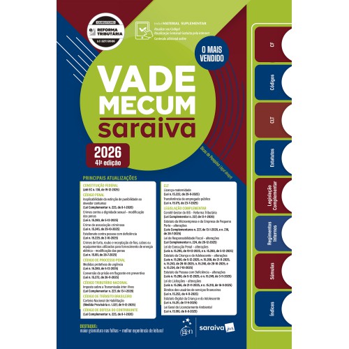 Com a tradição, organização e qualidade da SaraivaJur, o Vade Mecum Saraiva é seu aliado para os estudos, passar na OAB, alcançar a carreira pública dos seus sonhos e se destacar no mercado jurídico.