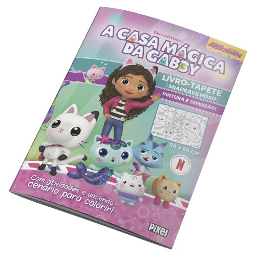O livro-tapete da Casa Mágica da Gabby é gatástico! Venham colorir e brincar com Gabby, Pandy Gato, DJ Risonho, Almofagata, Cake, Bebê Caixa, Kitty Fada, Gatuno e Sereiata em páginas para lá de divertidas e que podem ser compartilhadas! Neste livro q ue se transforma em um grande tapete de 96 x 66 cm, os pequenos e toda a sua família poderão participar juntos das atividades, resolvendo os variados passatempos e pintando a superilustração do verso. O formato diferente estimula a criatividade e con tribui com o desenvolvimento cognitivo e motor das crianças, favorecendo habilidades como raciocínio lógico e percepção visual. Então, reúnam a família, os amigos e venham todos passar momentos miauravilhosos com os integrantes da Casa Mágica da Gabb y!