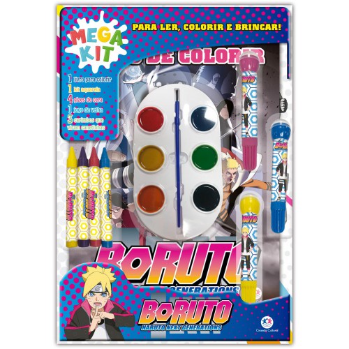 Prepare-se para muita diversão na companhia de Boruto e sua turma. Neste megakit ninja, há um livro dos personagens para colorir, gizes de cera, aquarelas, canetinhas com carimbos, além de um jogo para recortar e brincar! Contém: 1 - Livro, 3 - Canet inhas com Carimbo, 4 - Gizes de cera, 1 - Estojo com 6 aquarelas. Como usar as aquarelas? Passo 1: Molhe o pincel com um pouco de água. Passo 2: Passe o pincel na tinta da cor escolhida. Passo3: Passe o pincel na página para ver as cores em aquarela .