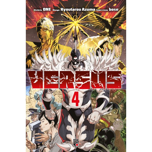 A guerra entre mundos avança para um novo e brutal estágio no volume 4 de VERSUS. Confrontos surpreendentes e estratégias desesperadas deixam toda a humanidade por um fio — e nada será como antes. A batalha pela sobrevivência da humanidade continua em Versus, a nova obra de ONE, o mesmo criador de One-Punch Man e Mob Psycho 100, ilustrada por Kyoutarou Azuma e com conceito de bose. A humanidade consegue transportar toda a sua base para longe e escapar dos demônios, dos alienígenas e da nova e g igantesca ameaça. Entretanto, não há lugar seguro em meio a este novo mundo. Diante de um novo inimigo, mesmo que os humanos sobrevivam aos temíveis parasitas, não escaparão das velozes motocicletas dos rebeldes de Anarquia.